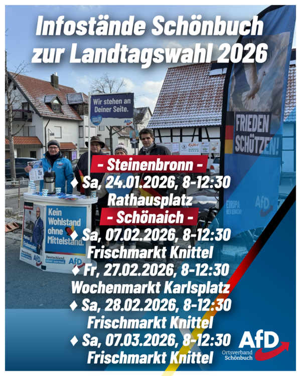 Für den Wahlkampf anlässlich der Landtagswahlen am 8. März sind wir vom AfD-Ortsverband Schönbuch bestens gerüstet. Neben den bereits am 6. Dezember (Weil im Schönbuch ) und 19. Dezember (Holzgerlingen) stattgefundenen Infoständen, bieten wir weitere an.