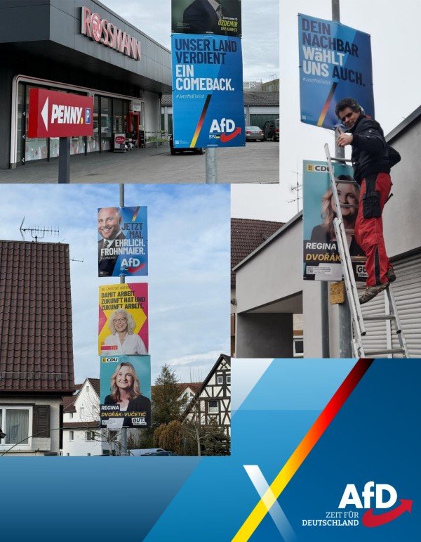 Trotz Wind und Graupelschauer hat am Sonntag 25.1. ein gut eingespieltes Team Schönaich in schönstem BLAU erstrahlen lassen. Die zahlreichen Plakate zeigen, woran wir fest glauben: Unser Land verdient ein Comeback!