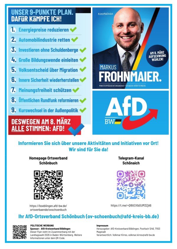 Dieser Flyer mit dem 9-Punkte-Programm der AfD zur Landtagswahl 2026 wird im Februar an alle Haushalte in Schönaich verteilt. Kann gerne jetzt schon im Bekanntenkreis weitergeleitet werden!